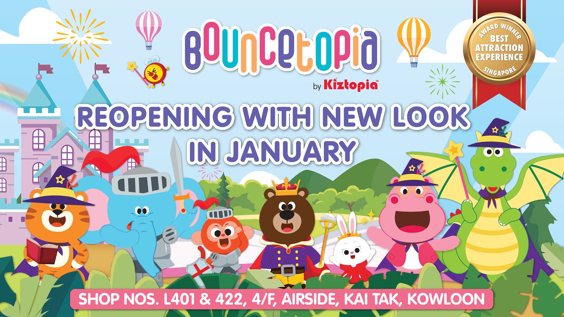 Bouncetopia by Kiztopia 致力融合「玩樂、學習和親子遊樂」於一身,為了讓網絡世代的孩子們回歸現實世界,勾起他們對活動身體的渴望,並從中獲得全方位遊樂和學習的樂趣,Bouncetopia 在室內遊樂場的主題概念和遊戲關卡設計上把創意發揮得淋漓盡致,希望能吸引孩童一踏進遊樂中心就自動動起來!這次啟德 AIRSIDE 旗艦店趁1週年這個特別日子來個大變身,帶大家從以往的熱帶叢林走到全新的冒險城堡,不論是大孩童還是小幼兒,都能享受一場驚險又有趣的勇者旅程。