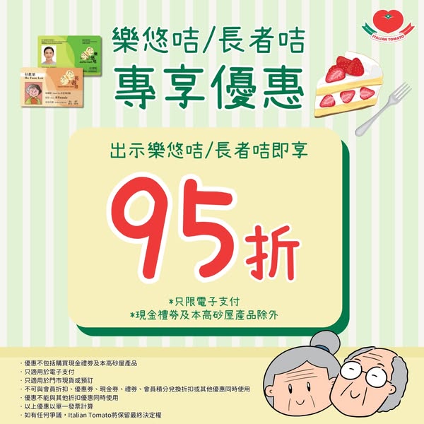 【樂悠咭/長者咭專享優惠】由即日起憑有效之樂悠咭/長者咭於Italian Tomato門市消費,並使用電子支付,即享95折優惠!立即到Italian Tomato門市選購心儀產品※優惠只適用於樂悠咭/長者咭之持有人。※優惠不包括購買現金禮券及本高砂屋產品。※只適用於電子支付。※不可與會員折扣、優惠券、現金券、禮券、會員積分兌換折扣或其他優惠同時使用。