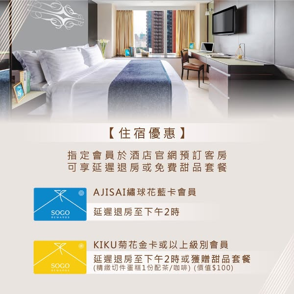 - KIKU 菊花金卡或以上級別會員:延遲退房至2:00pm 或 免費獲贈甜品套餐 (精緻切件蛋糕 1 份 + 茶/咖啡)(價值 $100)