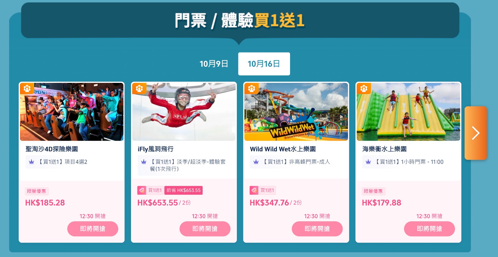 與此同時,Trip.com亦同步推出限時旅行產品,涵蓋新加坡多個頂級娛樂項目。鎖定 10 月 16 日的 12 點 30分則輪到聖淘沙 4D 探險樂園、iFly 風洞飛行及 Wild Wild Wet 水上樂園的門票買一送一優惠,助你發掘新加坡最精彩的景點。
