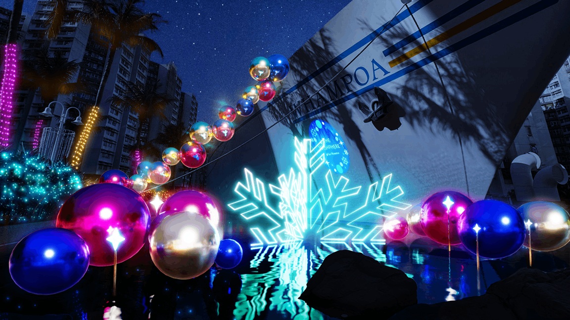 當聖誕燈飾化作跳動音符,鏡面光影奏出迷人旋律,這不僅是一場打卡之旅,更是戀人牽手、親子合照、朋友嬉笑的繽紛舞台!【THE WHISHPHERE@THE WHAMPOA】以聖誕、音樂與電影為靈感主軸,於黃埔號打造多個絢麗打卡熱點——從閃耀奪目的聖誕樹拱門裝置,到七彩光譜交織的藝術花園,再到飄浮雪花點綴的浪漫場景,整個空間化身為一座光影交錯的節日舞台,邀你沉浸於一場視覺與感官交融的聖誕盛典。
