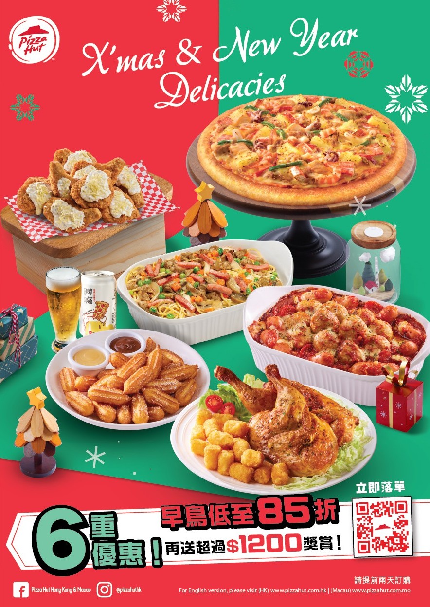- 早鳥優惠85折:於12月19日前經Pizza Hut網站或App預訂並輸入優惠碼【PHEB15】即可享折扣。