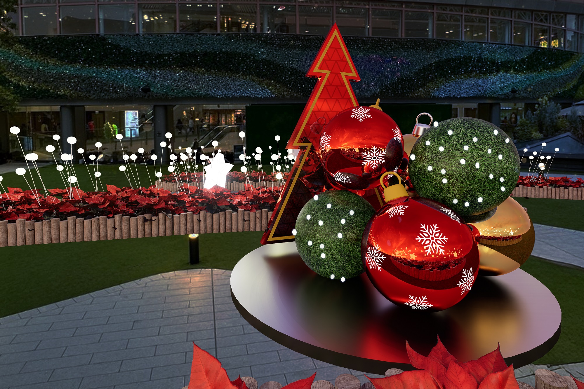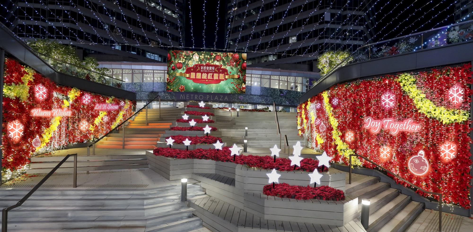 在另一邊的「聖誕星光之丘」,巨大的紅、綠和金色的聖誕球堆疊成獨特的聖誕打卡位,聖誕球上的雪花圖案和閃爍的星光,仿佛提醒我們冬天已靜悄悄降臨。而連接商場3樓及4樓的戶外樓梯則化身成「星願步道」,兩側盛開的聖誕花牆交相輝映,浪漫的聖誕裝飾與閃爍的燈飾交織在一起,情侶們漫步其間,猶如置身花的銀河,心動指數爆燈!