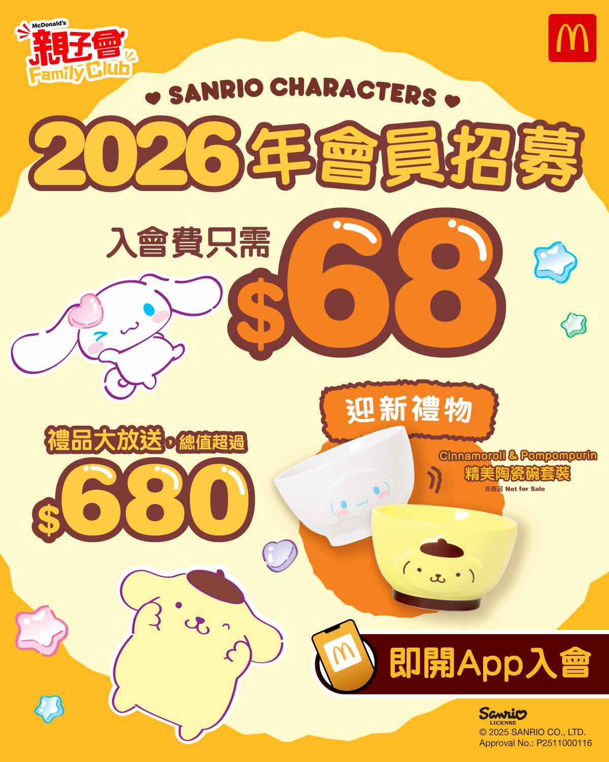 【$68加入2026親子會 額滿即止】 會費維持不變,入會即享超過$680禮遇: 迎新禮物: 精美卡通陶瓷碗套裝 (一套兩件) 免費迎新及節日禮遇 迎新餐:板燒雞腿飽 + 中汽水 生日禮遇:麥炸雞(原味/蜜糖BBQ)+ 中汽水 兒童節:免費新地 母親節:麥芝蛋飽 + 中汽水 父親節:McCafé凍即磨黑咖啡 全年無限次免費美食優惠 (用親子會優惠券點餐滿$30 或以上即可獲贈指定免費美食)另有 $48 或 1600分基本會籍,入會即賺! 即買即用,會籍有效期到2026年12月31日*禮品數量有限,送完即止。#麥當勞 #App #優惠 #親子會 #免費迎新餐