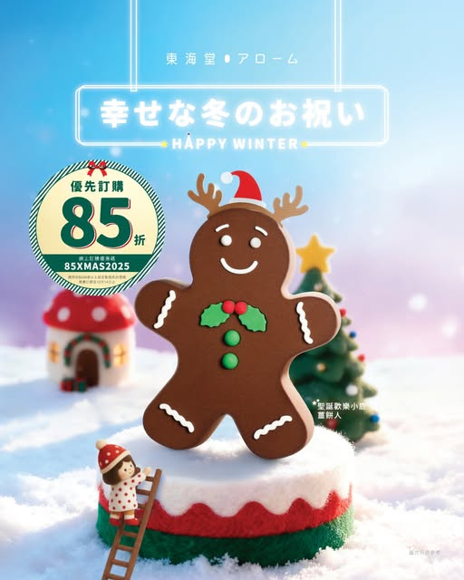 凡於12月14日或之前,蒞臨門市或網上(輸入優惠碼「85XMAS2025」)預訂$239或以上之指定聖誕系列蛋糕,即享優先訂購85折優惠
