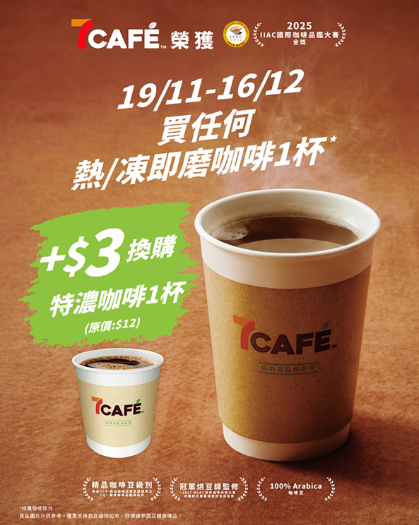 *由2025年11月19日早上7時至12月16日,購買任何7CAFÉ即磨咖啡1杯(熱凍均可),即可以優惠價$3換購特濃咖啡1杯(4安士)。優惠受條款及細則約束,詳情請參閲店舖宣傳品。