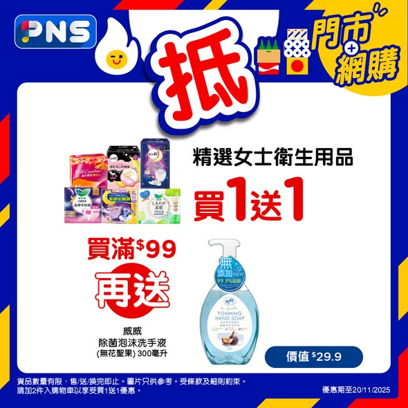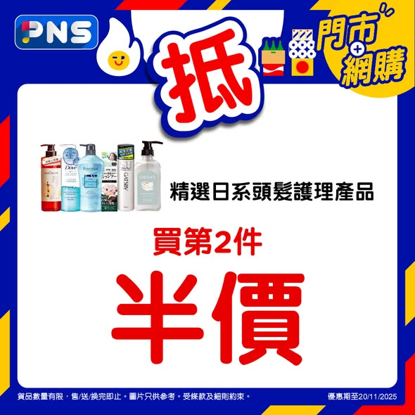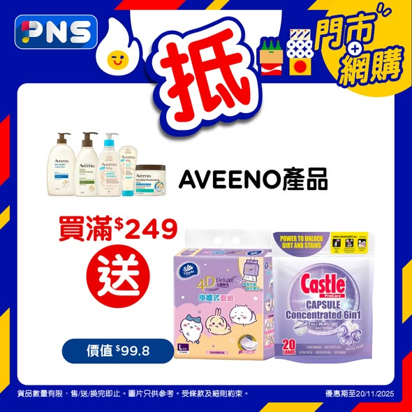 (折實價已反映在價錢牌)普樂氏優惠期至2026年1月31日。其他優惠期至2025年11月20日。日系頭髮護理產品、Aveeno及女士衛生用品優惠適用於有售賣此貨品之香港百佳店舖及PNS網購。其他優惠只適用於PNS網購之送貨訂單。需登入PNS網購以查看贈品優惠,贈品包裝/款式/口味由系統選擇。贈品數量有限,送完即止。優惠以每張訂單計算。圖片只供參考。受條款及細則約束。