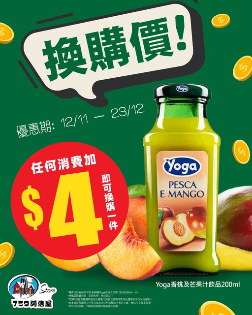 *購買任何貨品即可加 $4換購Yoga香桃及芒果汁飲品200ml 一件。
