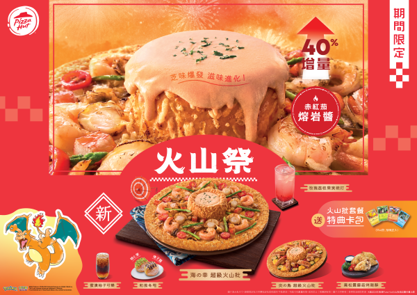 各位Pokémon訓練家注意!經過一年的精心修煉,Pizza Hut 再次帶來全城期待的年末火熱驚喜!Pokémon 有多種變化,讓人驚喜連連,深受不同年齡層喜愛,風靡全球!由2025年11月27日起,《Pokémon》再度強勢登陸 Pizza Hut,全新Pizza Hut超級火山祭火熱開催中,啟動味覺進化!Pizza Hut除了為大家帶來多間《Pokémon》主題店,更同步呈獻多款主題限定美食,勢必哄動全城!上回極受歡迎的火山批已完成進化,全新登場的「海の幸超級火山批」與「炎の鳥超級火山批」,將結合40%增量^的「赤紅茄熔岩醬」,如熔岩般引爆無窮滋味!除了超級火山批,還有「黑松露蘑菇烤雞酥」、「和風冬甩」等全新主題美食及特飲─「蜜漬柚子可樂」及「玫瑰荔枝果実梳打」坐鎮!11月27日起至12月19日,Hut Rewards會員更可以85折起限時試食「超級火山批套餐」**!百變怪更驚喜出現一人餐系列的包裝上,還特別新增期間限定驚喜主食-「屋台風大阪燒汁海鮮意粉」,將海鮮意粉融入日本風味。一系列主題美食均配以Pokémon包裝,包括兩款 Pokémon主題外賣 Pizza 盒、Pizza插牌、特飲杯套、杯墊等。凡惠顧超級火山批套餐,更可獲得寶可夢集換式卡牌遊戲特典卡!立即行動集齊4款,踏上冒險,成為最強訓練家!