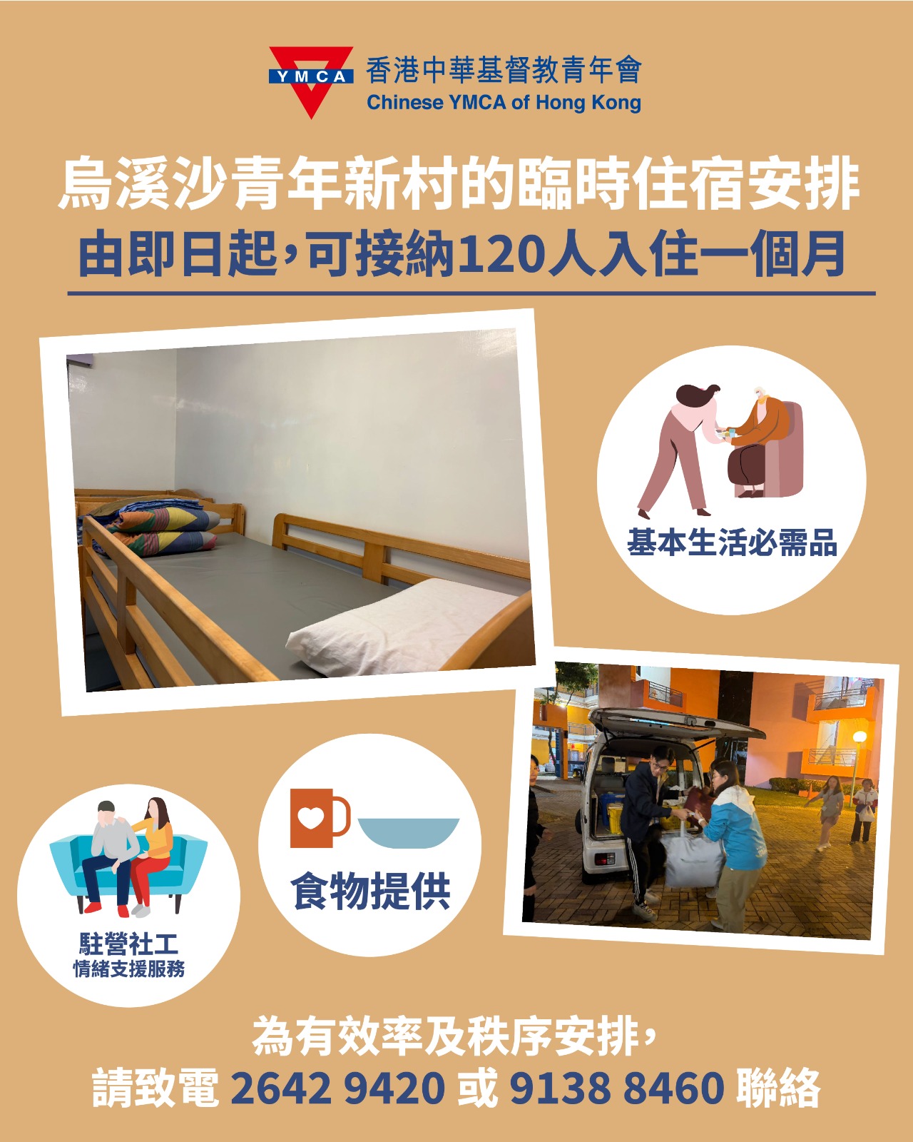 因應大埔宏福苑火警事故,香港中華基督教青年會(YMCA)烏溪沙青年新村(地址:馬鞍山鞍駿街2號)臨時住宿安排已延長至2025年12月27日,將預留120個免費宿位供受事件影響的人士使用,並且會提供免費膳食、基本生活必需品及平安藥包,並且有駐營社工提供24小時情緒支援服務。