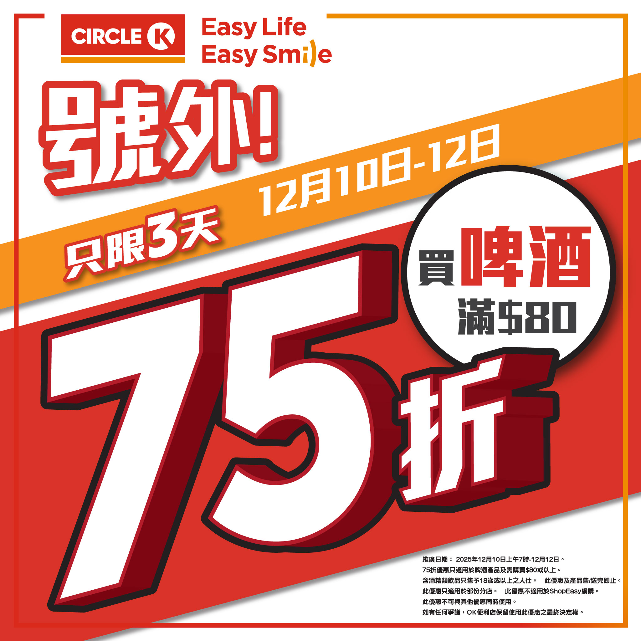 【3日限定】全場啤酒75折狂減!即日起!一連3日,購買任何啤酒產品滿$80即享75折多款精選啤酒優惠等緊你!快啲嚟Circle K 掃貨啦!精選優惠推薦:藍妹啤酒500毫升 4 罐裝 75折後平均每罐$7.9K1664白啤酒/BRUT法藍拉格啤酒500毫升巨罐裝75折後$7.5/件麒麟一番搾500毫升4罐裝75折後平均每罐$7.5朝日啤酒/超爽3.5啤酒500毫升罐裝75折後$6.8/件推廣日期:12月10日早上7時至12月12日(只限3天)-優惠須受條款及細則約束。-購買及飲用啤酒人士必須年滿18歲。#CircleK #OK便利店 #75折 #啤酒優惠 #著數 #限時優惠
