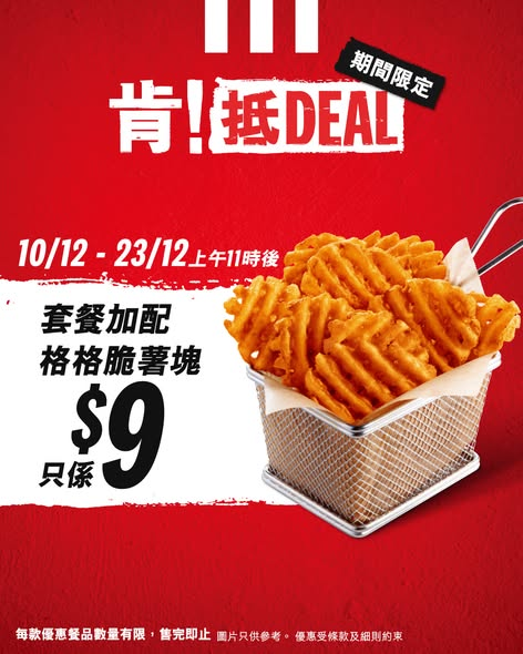 限定優惠聖誕就到喇!「肯!抵DEAL」踏入12月繼續有驚喜優惠,12月10日至12月23日期間為你送上多款至抵優惠,俾你日日都歎到KFC滋味!