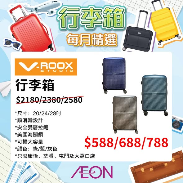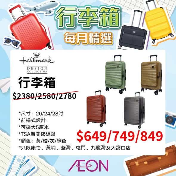 【行李喼每月精選】 AEON推出左行李喼每月精選,大家可以黎AEON買返個行李喼等聖誕新年去旅行用!推廣活動: 由即日起至12月31日分店位置:https://bit.ly/4gQpAT9了解更多:https://bit.ly/3BoVhDS24小時網上日式超市及更多網購資訊盡在 :https://www.aeoncity.com.hk/