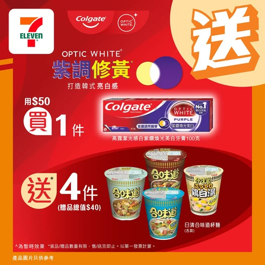【#著數之選 】 #至抵著數 今期7仔又有至抵優惠帶俾你由即日起至12月16日,嚟7仔買高露潔光感白紫鑽煥光美白牙膏100克1件(價值$50),即送日清合味道杯麵(各款)4件 (贈品總值$40)* !把握限時優惠,快啲去7-Eleven掃貨啦!*優惠有效期由2025年12月10日早上7時至12月16日。部分貨品只限於指定店舖提供。貨品及贈品數量有限,售/送/換完即止。以一單發票計算。如有爭議,所有價格以個別店舖為準。貨品圖片只供參考。就一切有關事宜,7-Eleven將保留最終之決定權。
