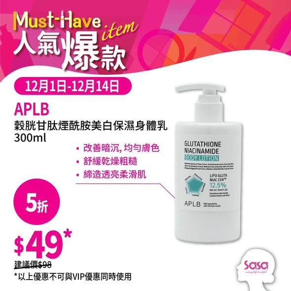 一切價錢以店舖展示為準。所有貨品、數量有限,先到先得,售/購/換完即止。所有折扣及優惠受條款及細則約束。莎莎化粧品有限公司保留最終決定權。 以上價錢只適用於香港分店,有關澳門分店價錢,請向澳門分店店員查詢。