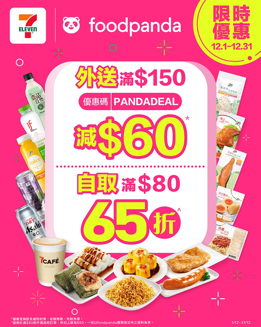 !即日起至12月31日,用優惠碼“PANDADEAL”喺foodpanda內7-Eleven訂購 #外送 / #自取 滿$150,#即減HKD60^