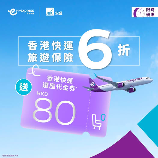 限時優惠︰6折買旅遊保+送 HKD80 香港快運選座代金券#