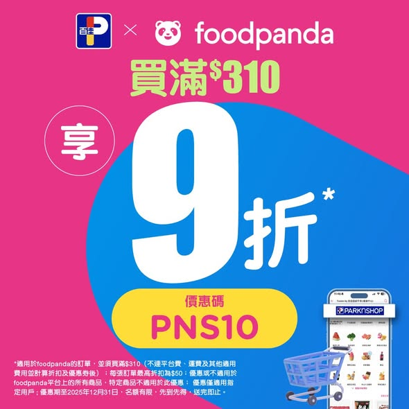 # 適用於foodpanda的訂單,並須買滿$310(不連平台費、運費及其他適用費用並計算折扣及優惠券後);每張訂單最高折扣為$50;優惠或不適用於foodpanda平台上的所有商品,特定商品不適用於此優惠; 優惠僅適用指定用戶 ; 優惠期至2025年12月31日,名額有限,先到先得,送完即止。