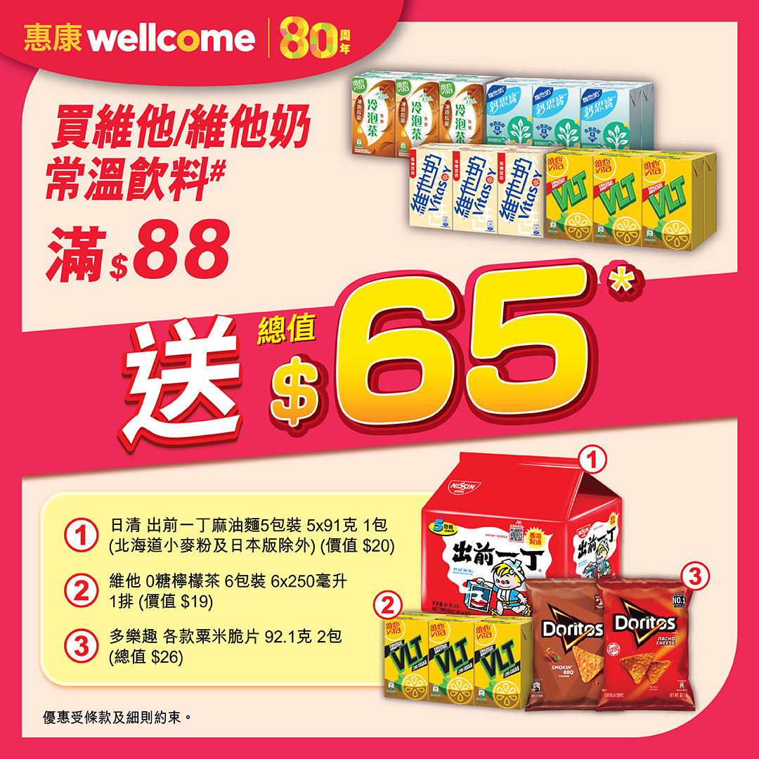 *買維他/維他奶常溫飲料#滿$88,送1包日清出前一丁麻油麵5包裝5x91克(北海道小麥粉及日本版除外)(價值$20)、1排維他0糖檸檬茶6包裝6x250毫升(價值$19)及2包多樂趣各款粟米脆片92.1克(總值$26),禮品總值$65