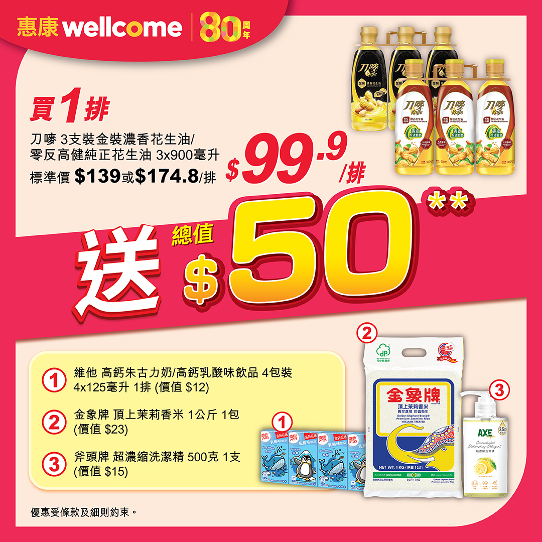 **買1排刀嘜3支裝金裝濃香花生油/零反高健純正花生油3x900毫升,送1排維他高鈣朱古力奶/高鈣乳酸味飲品4包裝4x125毫升(價值$12)、1包金象牌頂上茉莉香米1公斤(價值$23)及1支斧頭牌超濃縮洗潔精500克(價值$15),禮品總值$50