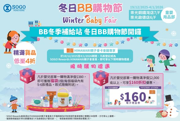 天氣轉涼,又係時候為 BB 準備齊晒冬日所需喇!崇光銅鑼灣店 7/F 及崇光啟德店 6/F 童嬰用品部,貼心呈獻「冬日 BB 購物節 Winter Baby Fair」,精選多款人氣童嬰用品低至 4 折,幫爸媽輕鬆又精明咁入手