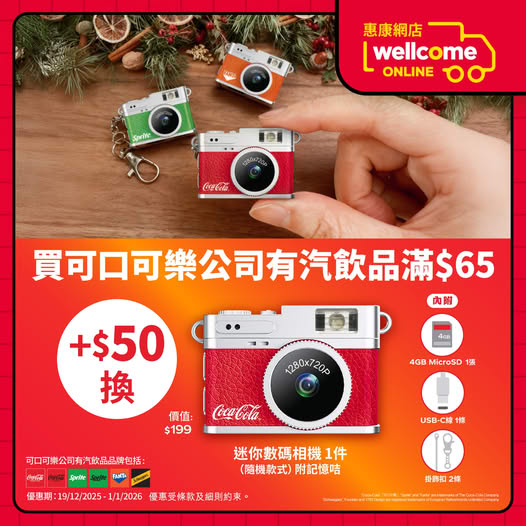 【惠康獨家限定 可口可樂™迷你數碼相機! 】獨家換購!依家嚟惠康網店買可口可樂公司有汽產品滿$65,即可以加+$50換領迷你數碼相機1件(隨機款式)!仲包埋SD card,可以即開即用!可口可樂™迷你數碼相機盲盒內含:可口可樂™迷你數碼相機1部 (隨機款式)4GB MicroSD 1張USB-C線 1條掛飾扣 2條優惠期:19/12-1/1/2026優惠適用於惠康網店/Market Place網店/yuu網購。以單一發票及折實價計算。貨品數量有限,售完即止。實際取貨日期貨會因應實際情況有所改變或延誤。受條款及細則束。貨品圖片只供參考。惠康APP最快24小時送貨,滿$50可網購店取