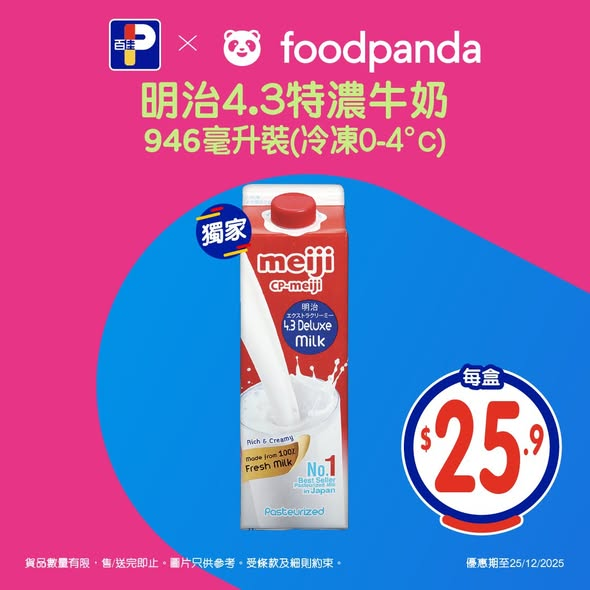 明治4.3特濃牛奶946毫升(冷凍 0-4°c),優惠價$25.9/盒