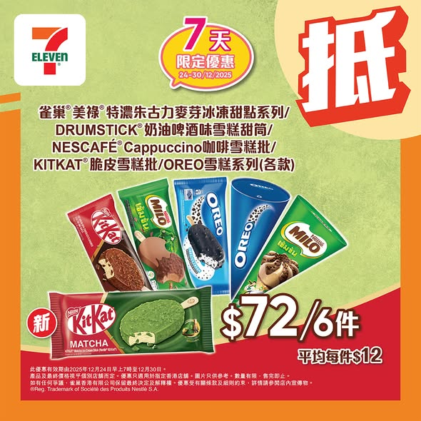 平均每件$9 *優惠有效期由2025年12月24日早上7時至12月30日。優惠只適用於香港店舖。部分貨品只限於指定店舖提供。貨品數量有限,售完即止。如有爭議,所有價格以個別店舖為準。貨品圖片只供參考。就一切有關事宜,7-Eleven將保留最終之決定權。