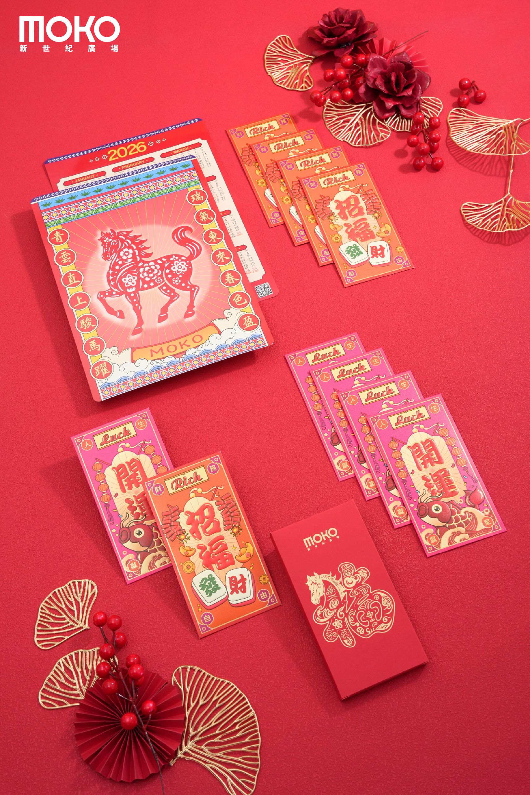 新世紀廣場隆重呈獻【新春開運馬年企劃】,多重節日驚喜與您共迎福氣滿盈的馬年。今年,MOKO以創意與傳統交織,率先推出極具收藏價值的賀年好物 —「財福滿JOY利是封」融合潮語與喜慶元素;「馬到Luck來2026年曆卡」則以復古曆書為靈感,寓意新一年好運連連,更準備了「Horse連連開運禮盒」,讓您傳遞雙倍新春至誠祝福!