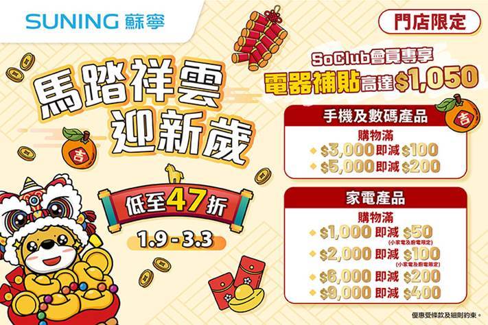 辭舊迎新,喜迎佳節!想為親人、朋友及另一半送上最貼心的祝福,實用的智能產品及家庭電器絕對是送禮首選。香港蘇寧全新《馬踏祥雲迎新歲》優惠強勢啟動,全場精選產品低至47折發售。SoClub會員更可專享電器補貼優惠:蘇寧門市家電補貼高達$1,050,而網店電器補貼更高達$4,600!立即來蘇寧入手心水電器,為家居增添新氣象,優惠期由即日起至2026年3月3日。