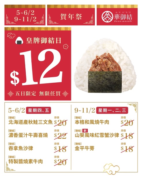 ,一邊期待農曆新年?由2月5日至11日(星期六、日除外),多款經典同新口味御結都會輪流以$12上架