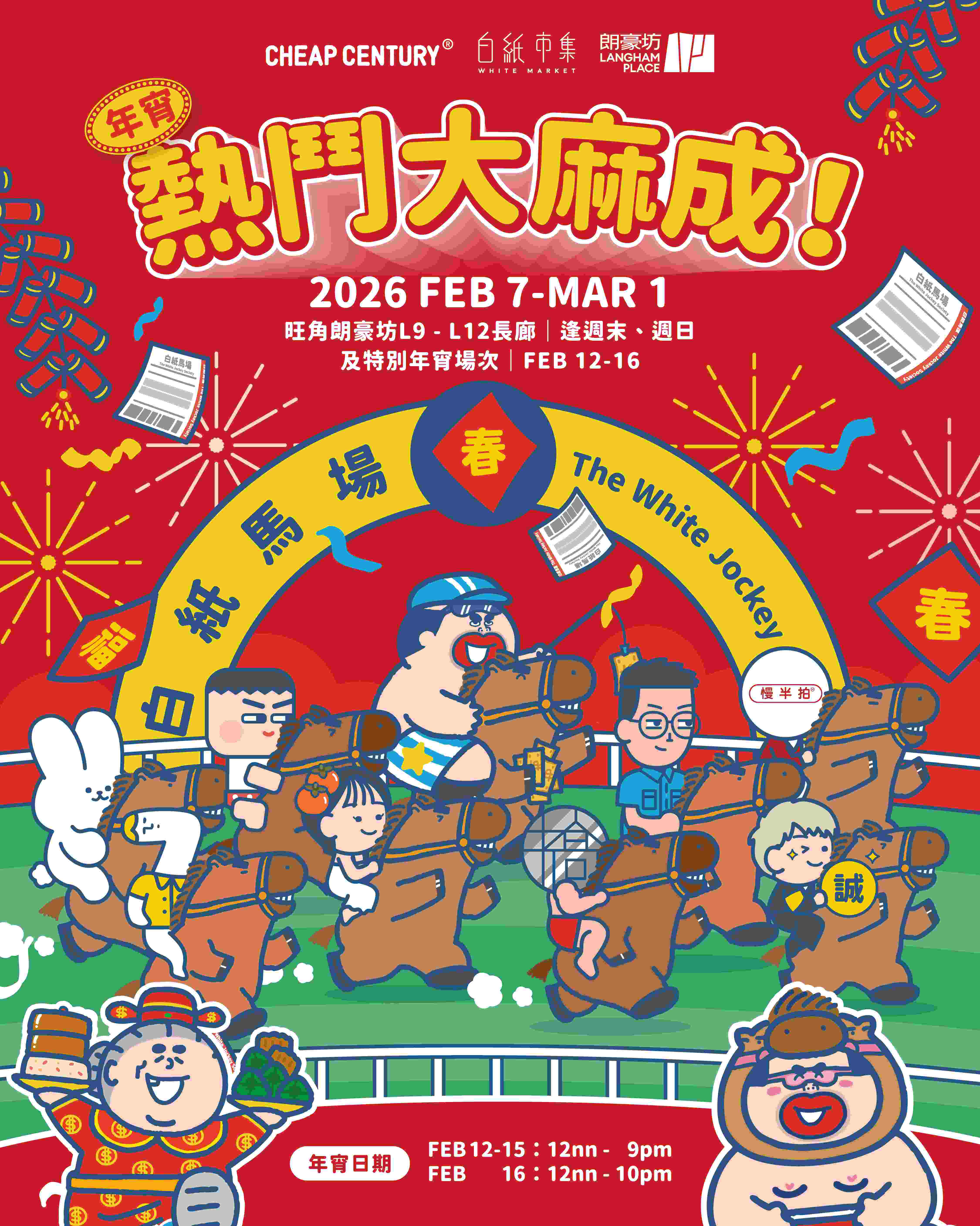 大麻成更特別為今個馬年市集製作新春版 Mascot「大馬成」,於 2 月 12 至 16 日年宵市集期間「沙圈亮相」現身朗豪坊不同樓層,派發「白紙馬場幸運馬票」,成功捕捉「大馬成」的顧客,憑「幸運馬票」到 12 樓白紙生活概念館櫥窗及「幸運馬票兌換處」「對飛」,即有機會得到 HK$20 市集購物券,增添互動驚喜。新春年初五、六﹙2月21及22日﹚,市集將限時推出兩大Sure Win玩味互動遊戲—「人強馬壯舉」10公斤獎盃舉重挑戰及「全民拉頭馬」熱鬥馬仔比賽,新鮮感與娛樂性雙爆燈,快約老Best來朗豪坊碼住馬年熱鬧盛況!