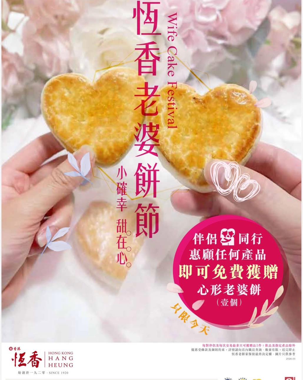 伴侶同⾏禮遇|即送⼼形⽼婆餅恆⾹⽼婆餅節活動期間內,凡兩位顧客以「伴侶形式」同⾏
