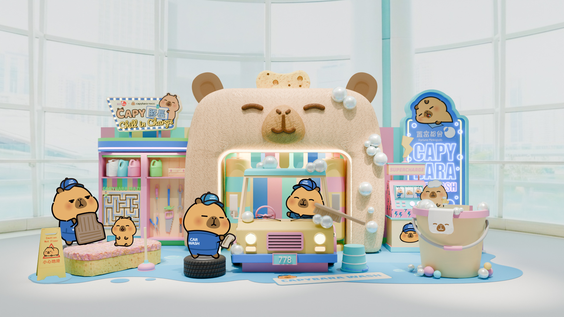 Charge」春季裝置,作為水豚的一員,圓碌碌的小黃豚頭和身的1:1比例展示「圓」美身形,四肢短小卻靈活,字典裏面沒有「壓力」二字,好吃好睡實行佛系生活,最享受是閉目泡溫泉,招牌的零表情給人一種鬆弛治癒感,偶爾一笑又可以萌倒眾生。首次來港就到置富Malls旗下2大商場,以「豚」長身份整頓職場,擺脫社畜壓力,包括:馬鞍山廣場的豚長Chill慢餐店, 充滿50年代美式復古感,繽紛搶眼的3米高小黃豚漢堡招牌之下,豚長可以無視心急人客,踩着溜冰鞋卻以「靜」制動地0速送餐,展現「帶薪發呆」的功力!而紅磡置富都會的豚長Chill慢洗車屋,熱愛泡澡的豚長,示範如何在4米高小黃豚自動洗車