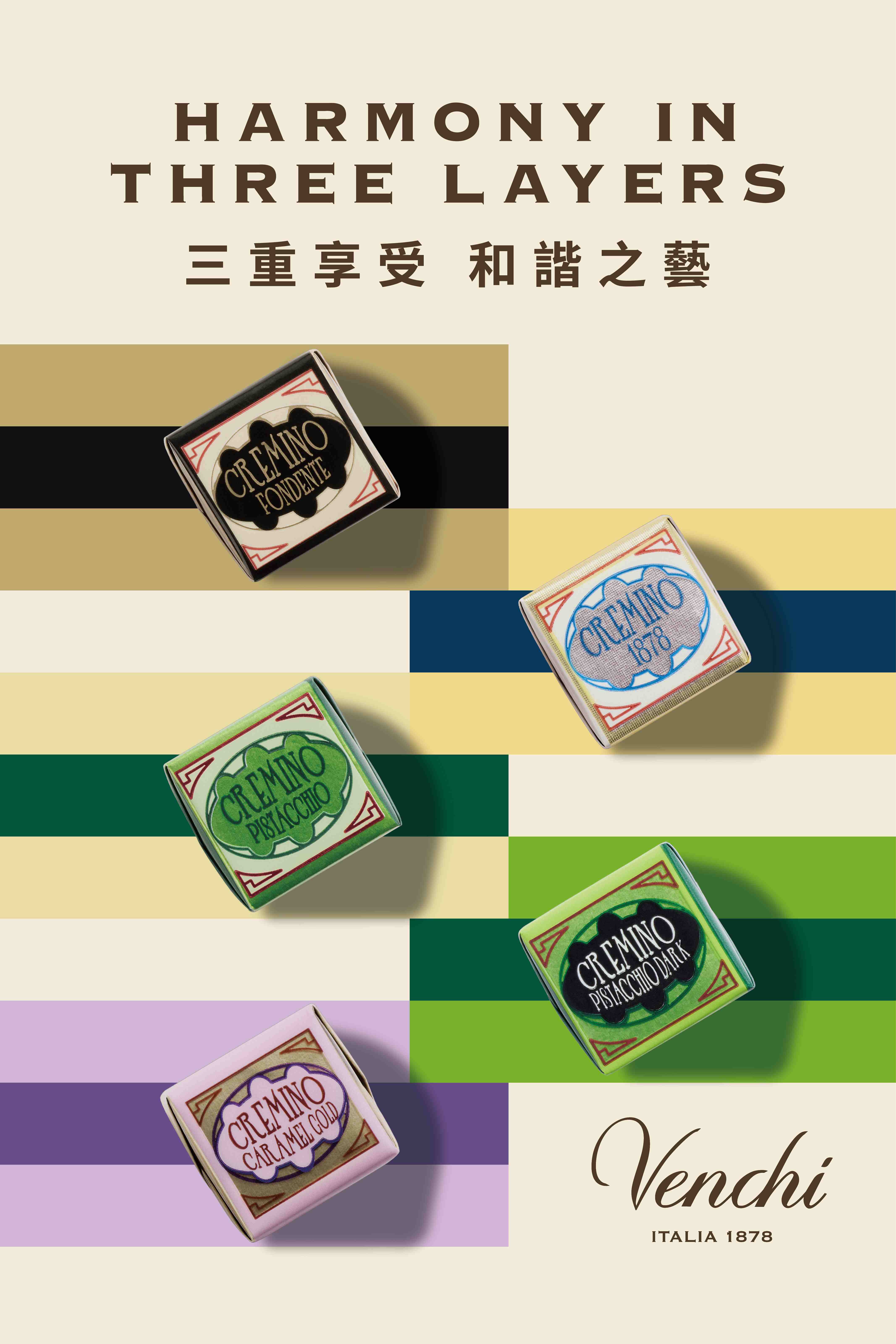「3」在西方文化中象徵完整、和諧與平衡,正如意大利巧克力與意式雪糕品牌 Venchi 的經典 Cremino 巧克力系列,以三層匠心工藝締造細膩和諧的味覺享受。自1878年創立以來,Venchi 堅信每一口巧克力都承載著回憶、情感與歲月的味道。擁有百年歷史的Cremino系列是Venchi的標誌之作,以經典意大利風格為傳統注入創新元素,研發出完美的三層方形巧克力,層次豐富,質感細膩,入口即化。三層口味細膩交織,層次分明卻彼此融合,成就 Cremino 獨有的三重和諧之美。每一口 Cremino 巧克力都承著百年工藝與可可文化的深厚底蘊,將品味昇華至生活美學的境界,更以優雅平衡的口感媲美極致茶道的儀式感,低調而優雅地呈現真正的品質。Cremino 巧克力系列有5款精緻口味選擇,詳見附件。
