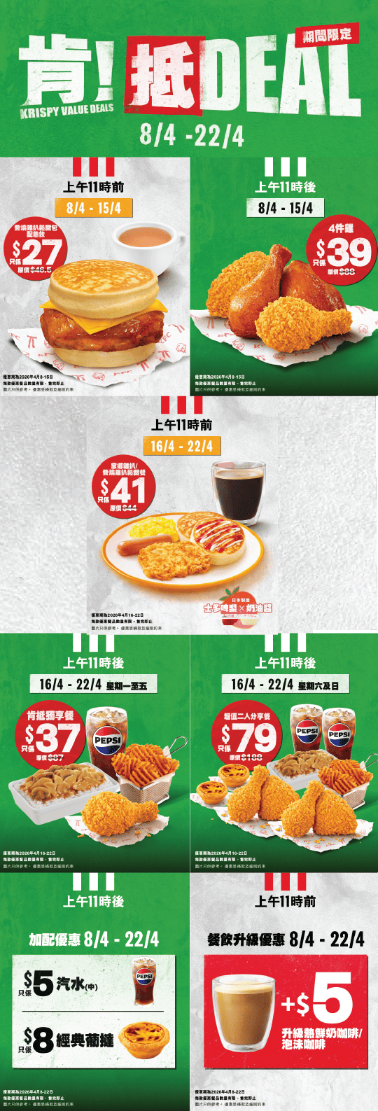-優惠於香港及澳門肯德基餐廳於指定時段供應 (不適用於亞洲國際博覽館分店)。
