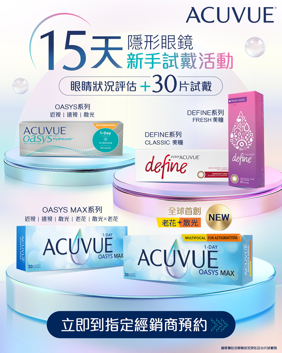 由即日起至6月30日,親臨指定ACUVUE經銷商預約視光檢查,只需基本驗眼費,即可享專業眼睛狀況評估,兼獲贈 30片隱形眼鏡試戴裝*,讓你連續體驗 15 日無框自在生活!