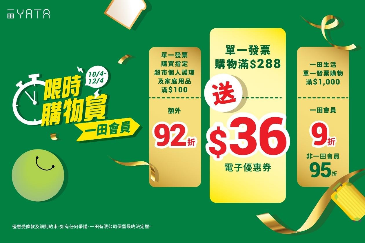 第一重:一田會員於全線一田單一發票購物滿 $288,送 $36電子優惠券;