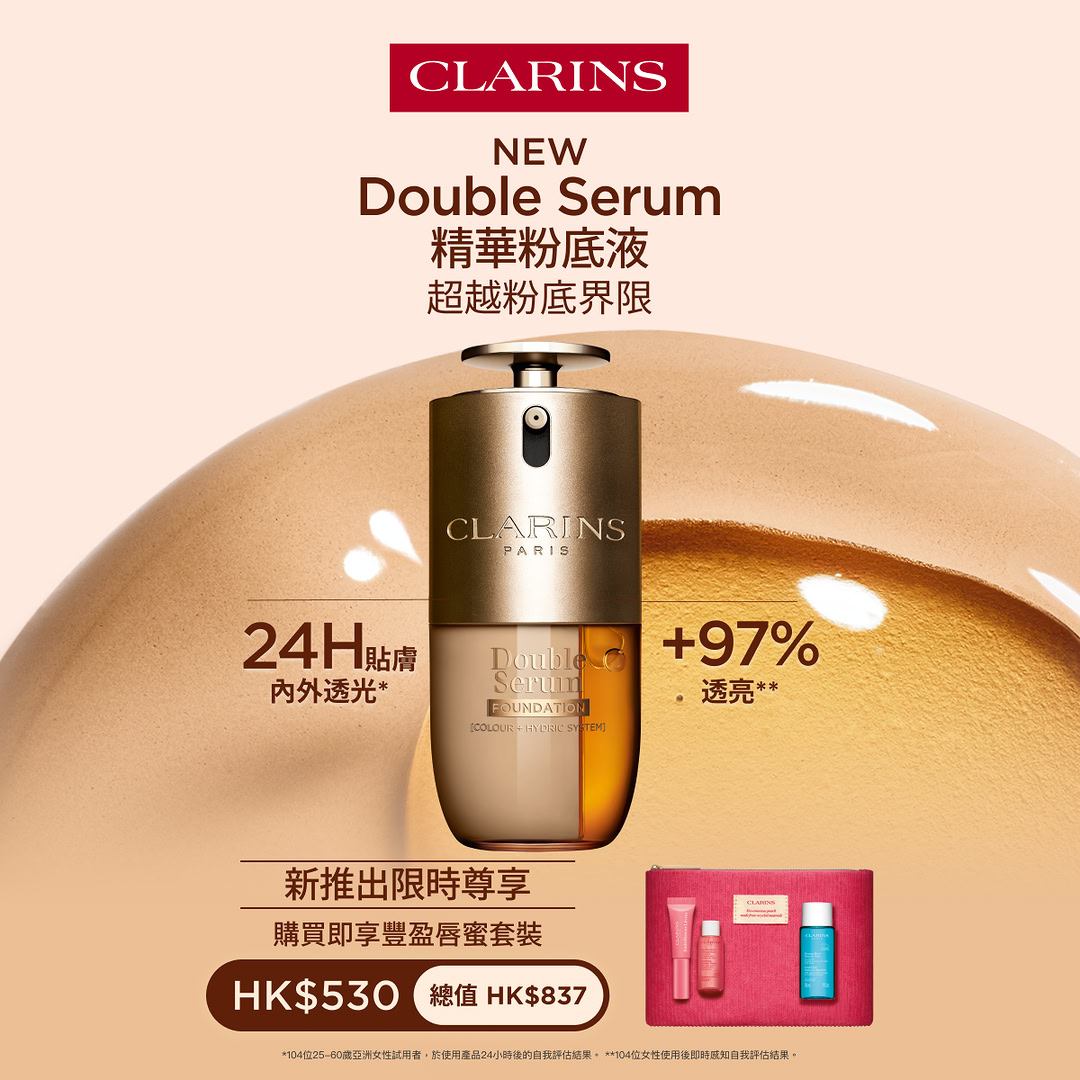 贈豐盈唇蜜旅行套裝價值HK$307】承傳Double Serum專屬雙管設計,CLARINS將經典再次昇華,隆重推出Double Serum精華粉底液