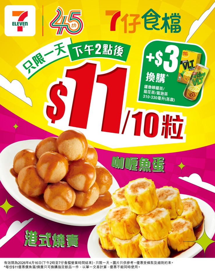 ^優惠有效期為2026年4月16日(下午2時至7仔食檔營業時間結束),只限一天。以單一交易計算。每份$11優惠價魚蛋/燒賣只可換領指定飲品一件。圖片只供參考。貨品/贈品數量有限,售/送/換完即止。優惠受條款及細則約束,詳情請參閱7-Eleven應用程式。