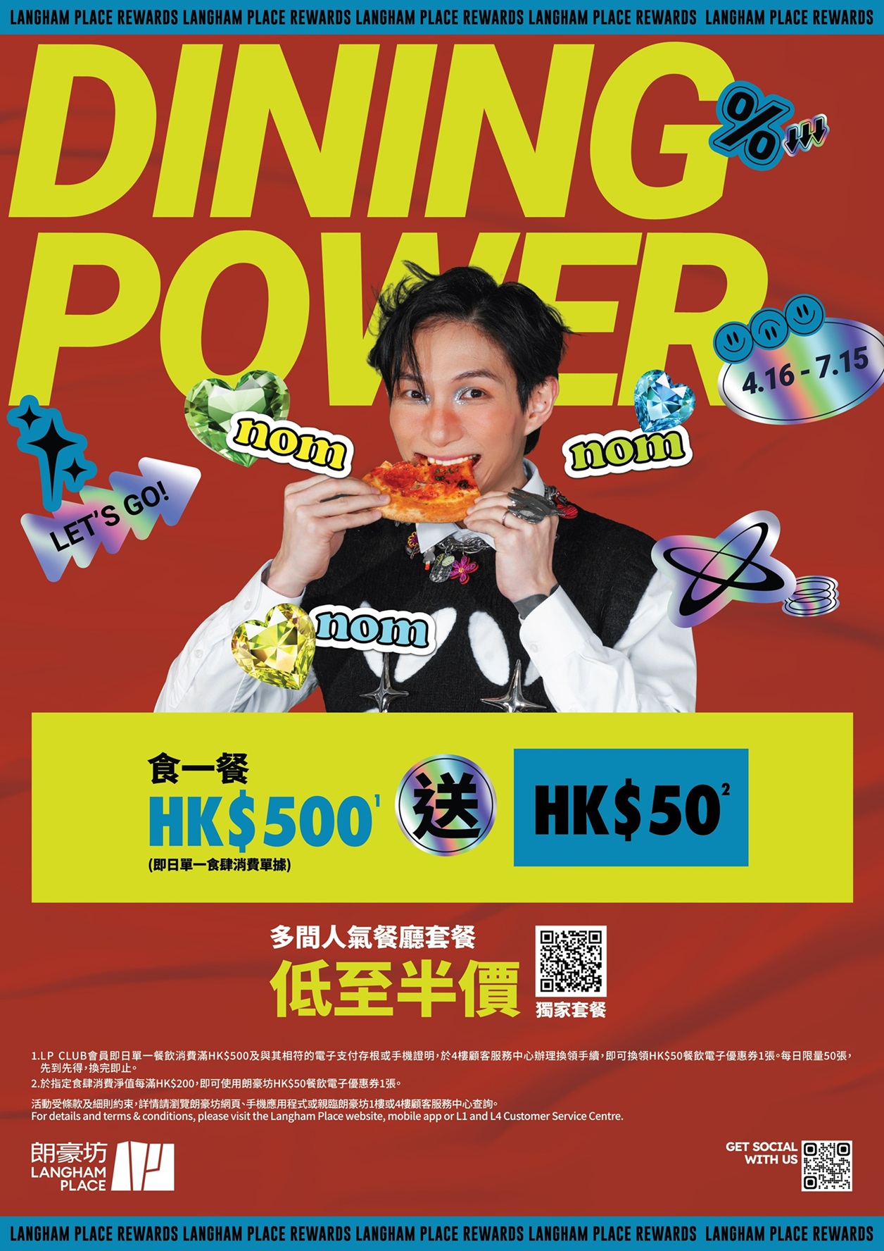 POWER」獨家餐飲企劃,為一眾熱愛美食的潮流達人帶來極致的消費體驗!商場餐飲版圖再度華麗升級,強勢匯聚中、西、意、美、日、泰、越等多國頂級佳餚,打造國際級味覺饗宴。是次企劃由4月中旬啟動,橫跨「5.1黃金周」至暑假,聯乘場內多間人氣新店及經典食府,破天荒推出低至半價的朗豪坊專享套餐,更連續三個月狂派高達30萬港元餐飲券!配合Alipay隨機立減驚喜、針對自駕客的升級泊車禮遇及「粵車南下」熱潮優化的泊車配套,三重優惠層層疊加,勢必成為今夏最Dope的搵食天堂!