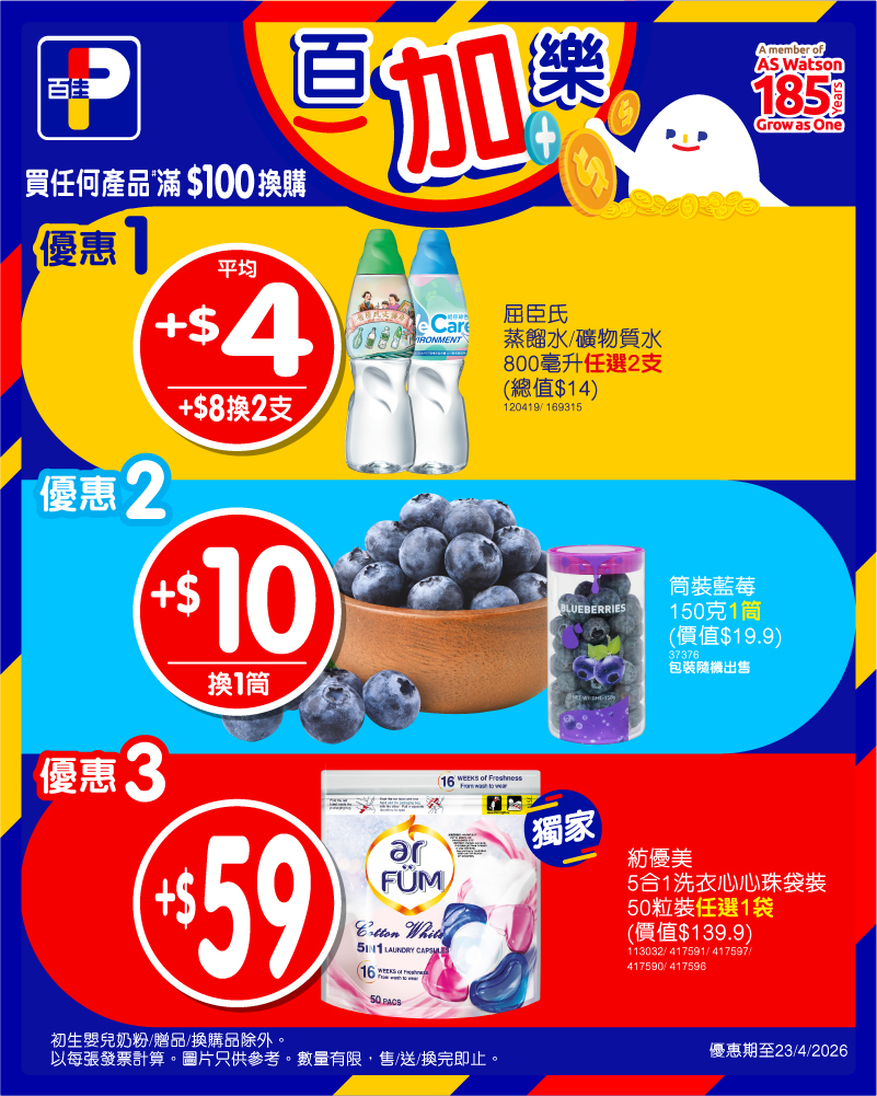 *優惠至23/4/2026。以上優惠適用於大部分香港百佳、FUSION、TASTE、INTERNATIONAL 有售,並不適用於百佳旗下的其他超市品牌、百佳快閃特賣埸及新鮮食品優惠並不適用於 TASTE x FRESH 新鮮生活之店舖。貨品數量有限,售/送/換完即止。圖片只供參考。受條款及細則約束。以每張發票計算。# 初生嬰兒奶粉、贈品及換購品除外