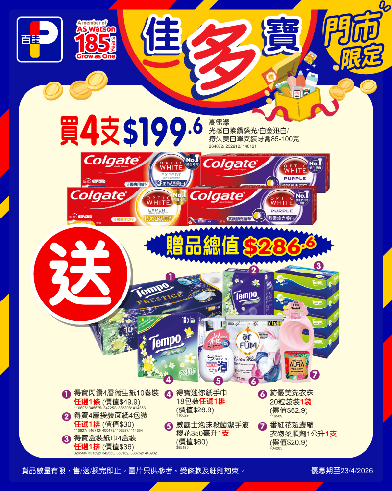 而家喺百佳門市買4支指定高露潔牙膏只需要$199.6,再送總值$286.6嘅贈品!
