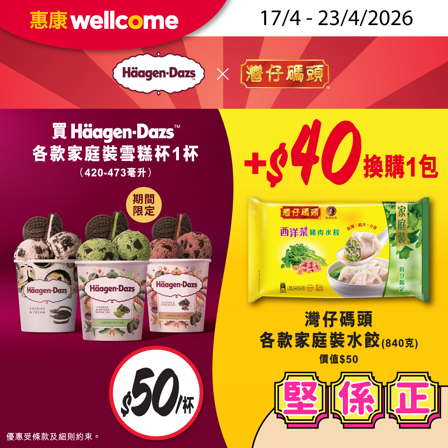 買Häagen-Dazs™ 各款家庭裝雪糕杯(420-473毫升)1杯 +$40換購1包灣仔碼頭各款家庭裝水餃(840克),價值$50