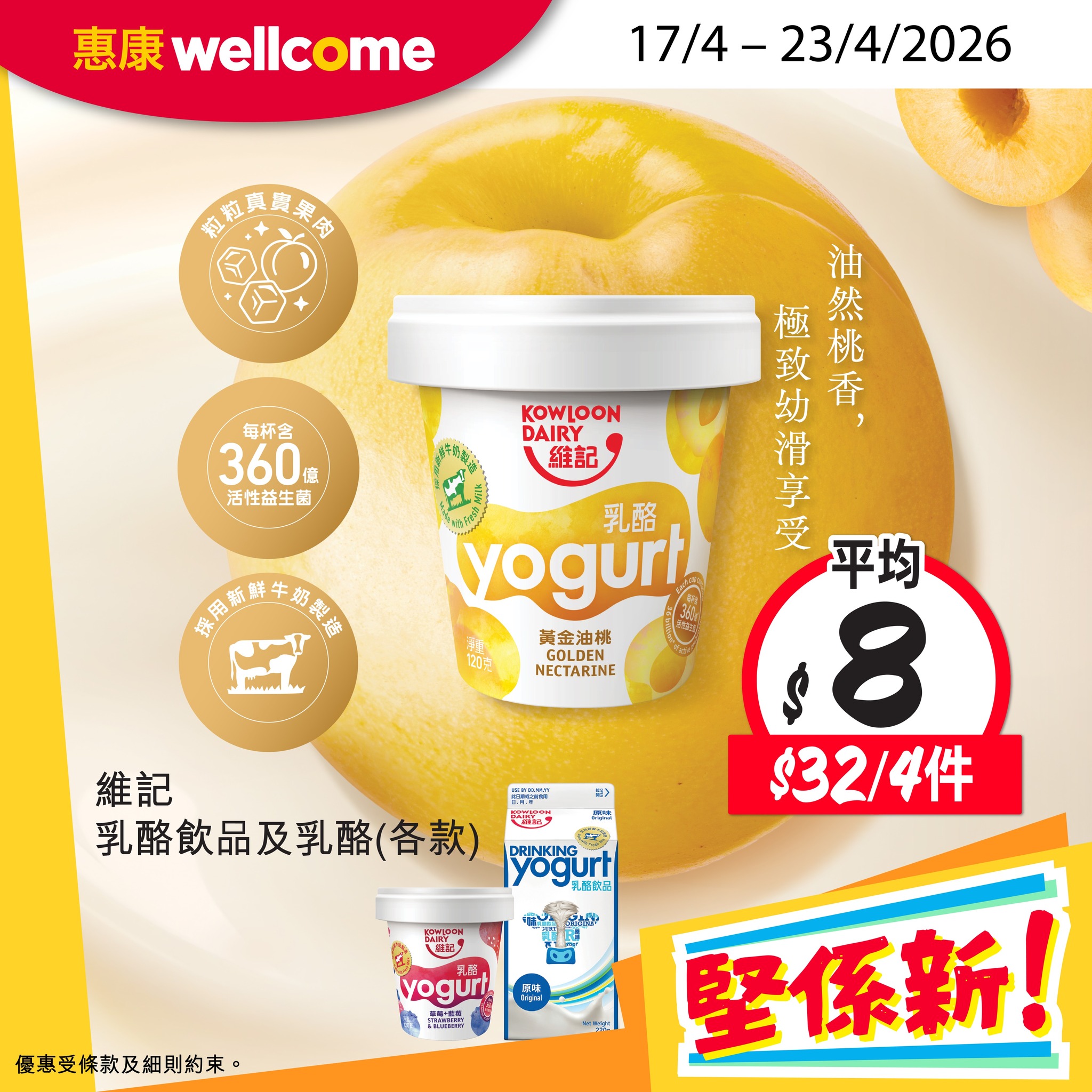 維記 各款乳酪飲品/乳酪 優惠價$32/4件,平均$8/件維記黃金油桃乳酪採用100%鮮牛奶