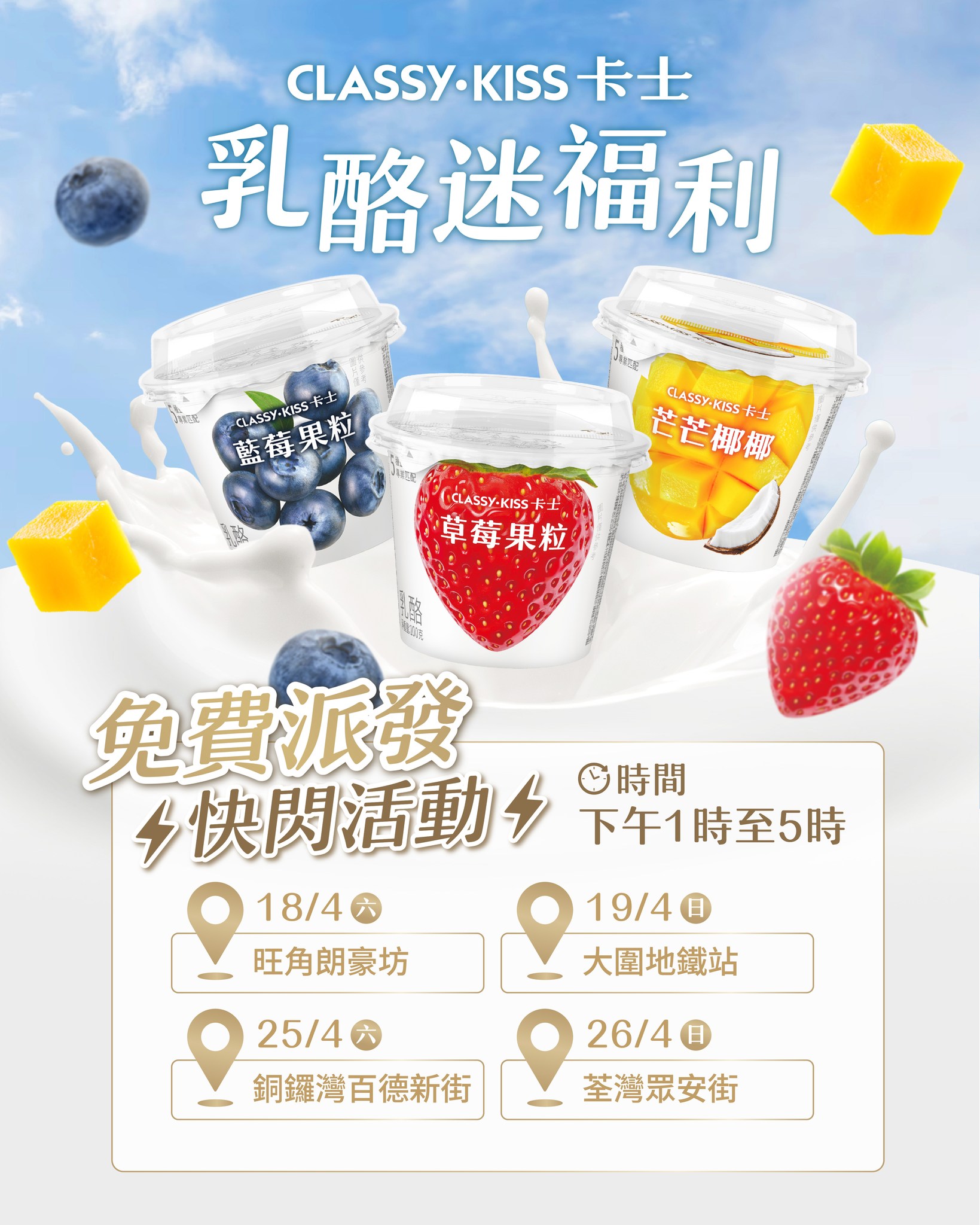 【免費派發!│ 卡士限時快閃活動】嚟緊兩個週末,我哋會喺以下地點有免費派發卡士乳酪嘅快閃活動只要現場讚好卡士的Facebook 或Instagram專頁,即可免費獲得水果乳酪一杯* 快啲mark低以下日子同地點,約埋親朋好友一齊嚟喇!快閃活動詳情:18/4 旺角朗豪坊19/4 大圍地鐵站25/4 銅鑼灣百德新街26/4 荃灣眾安街*乳酪口味隨機派發,數量有限,派完即止。** 視乎現場路面情況,派發地點或有機會更改。如有任何爭議,本公司將保留最終決定權。#卡士 #乳酪 #ClassyKiss #益生菌 #健康美味 #新品登場 #雙重口味 口感豐富 #促進腸道健康 #骨酪健康 #啖啖果肉