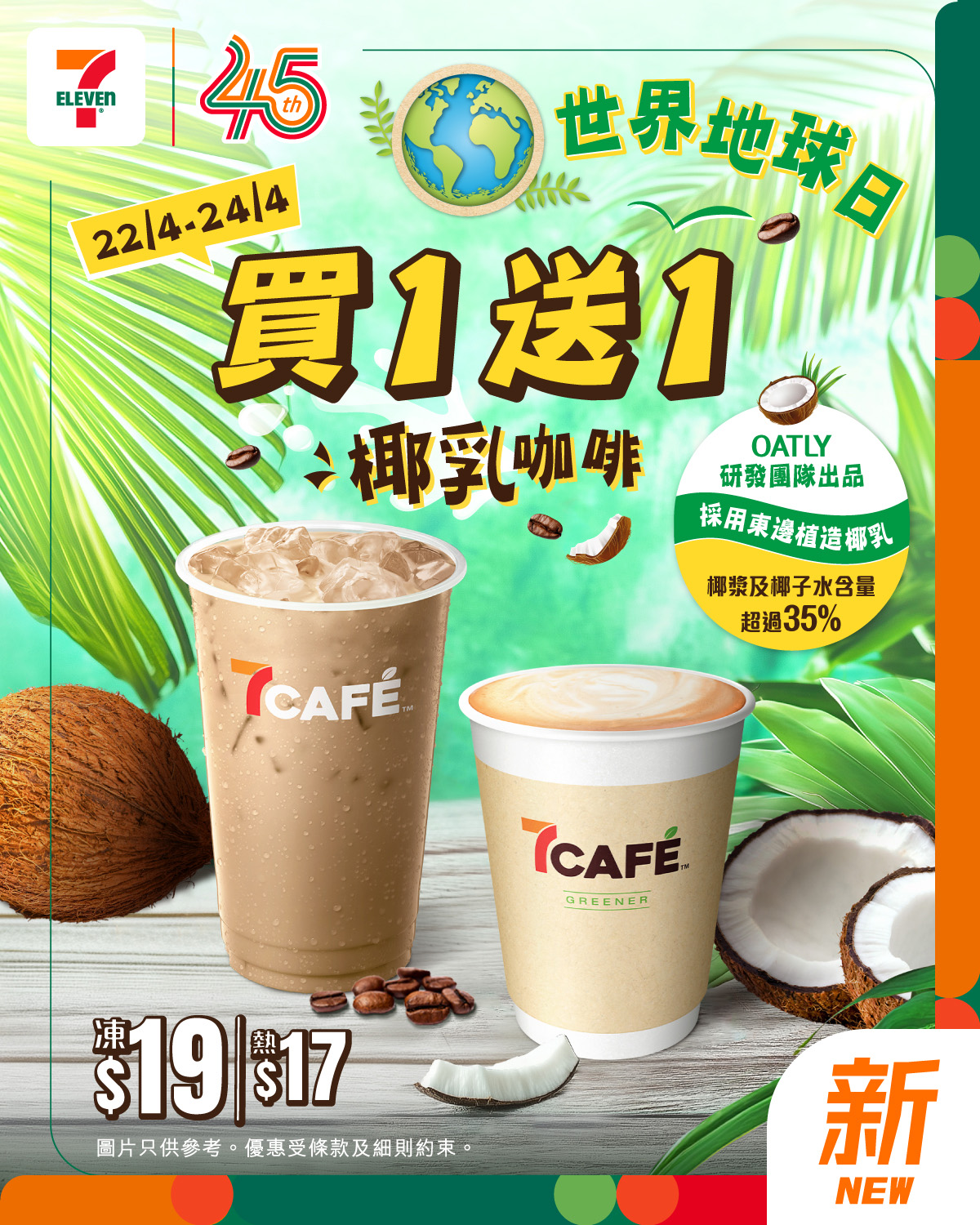 全新期間限定椰乳咖啡^,使用由瑞典品牌OATLY研發團隊出品嘅東邊植造椰乳椰漿同椰子水嘅含量超過35%椰香濃郁,清甜不膩,配合7CAFÉ即磨咖啡帶出香濃椰奶香味帶嚟層次豐富嘅味覺享受亦不含乳糖,相比以傳統牛奶製作嘅咖啡排放少啲溫室氣體,對地球就更友善啦而且價錢不變(熱飲$17/凍飲$19),一齊行多步,支持同愛護我哋嘅地球啦!